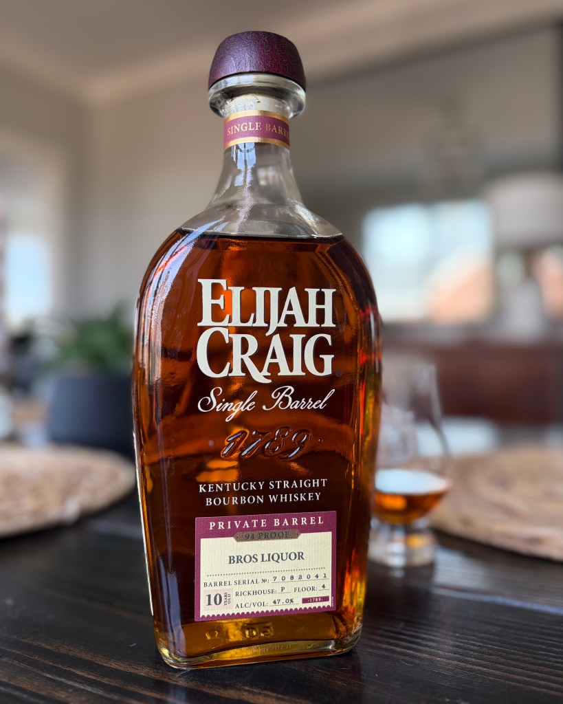 Elijah Craig Single Barrel Kentucky Straight Bourbon Whiskey – barrel #7082041 – selected by Russell’s Renegades, The Mash Up, and friends for Bros. Liquor – 94 proof – aged 10 years on the fourth floor of rickhouse P – distilled and bottled by the Elijah Craig Distillery Co. (Heaven Hill), Bardstown, KY